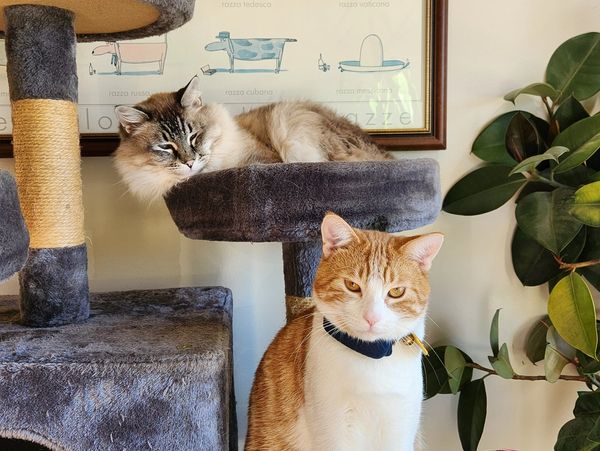 Harvey and Waffles are our two clinic cats. Harvey (Maine Coon Mix) is 12 and Waffles (Orange Tabby) is 2 years old. Harvey enjoys supervising everyone and Waffles enjoys eating everything in sight and escaping every chance he gets.